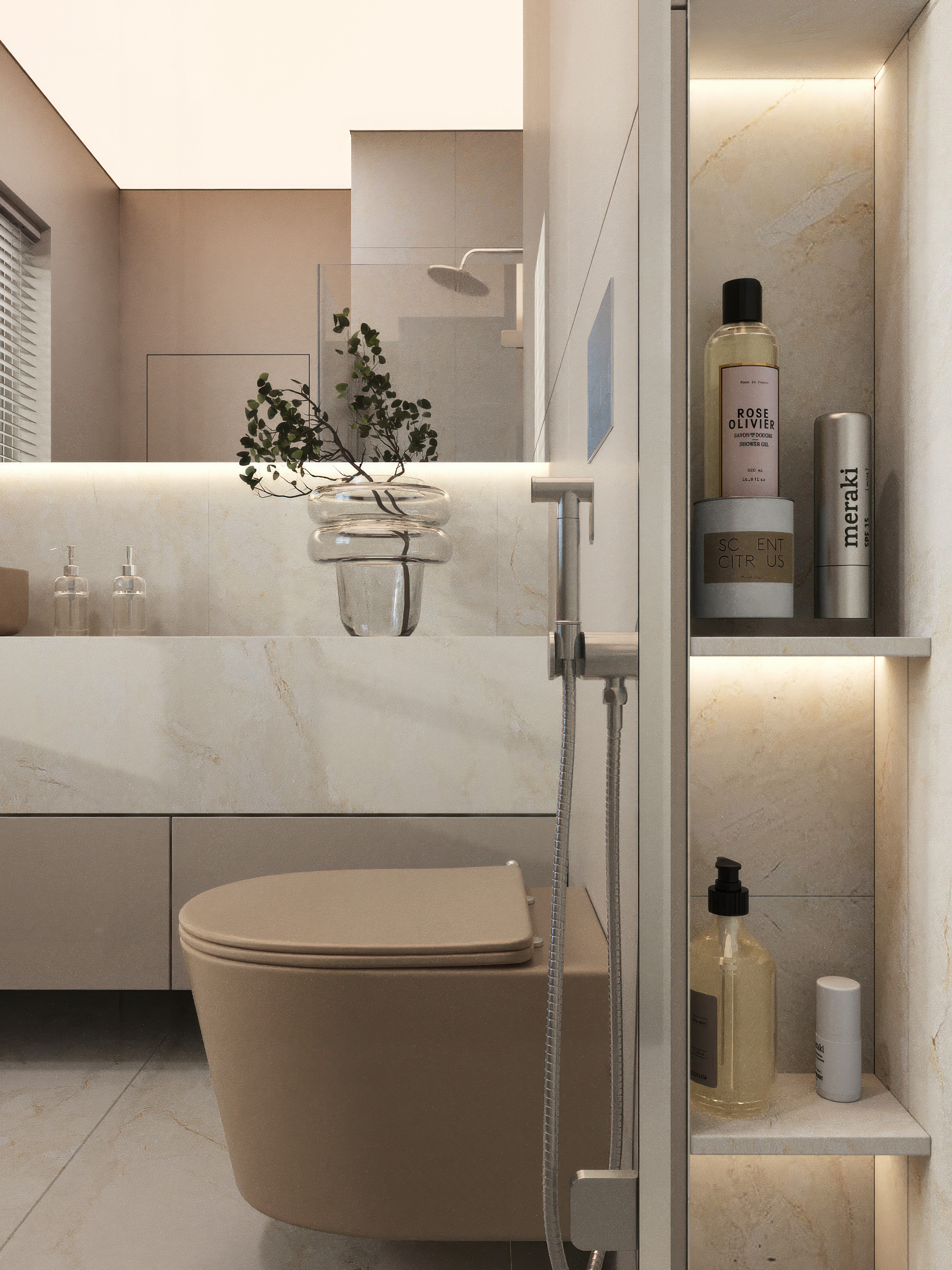 В проекте использованы сочетание новых оттенков коллекции керамики бежевый матовый и сантехники цвет оружейной стали, что делают проект неповторимым.